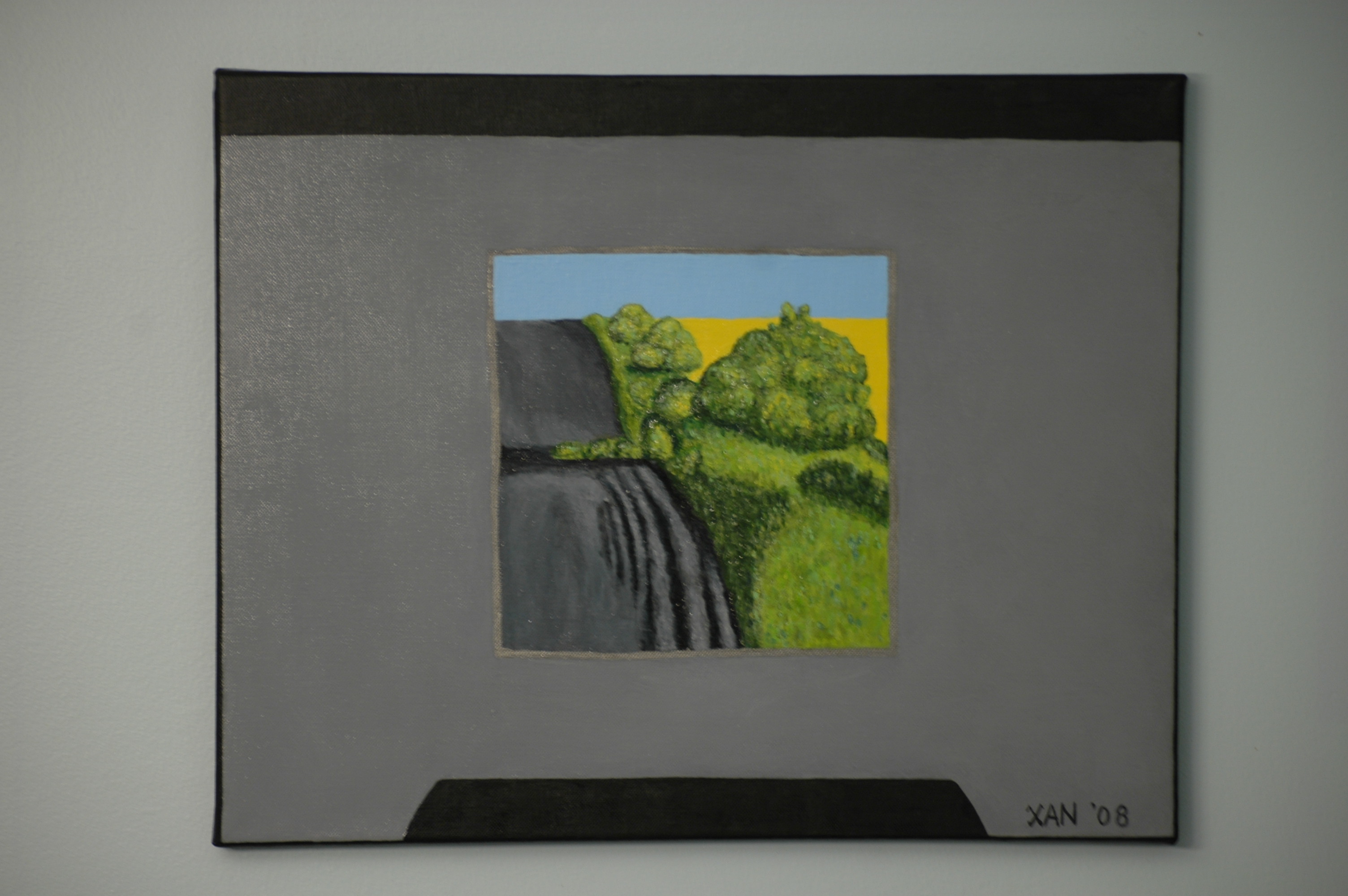 So, even my young son could not remain unaware of the ‘free speech/Human Rignts Commissions’ controversy brewing in our fair homeland of Canada.  Perhaps the most visible (certainly the most colourful) free speech advocate in Canada right now – in my never-humble-opinion, is Mr. Ezra Levant.  I admit, I have become fascinated with the ‘gray dungeon’ Mr. Levant was interrogated in by the Alberta HRC Inquisitoress in, seeing its ‘grayness’ with the painting of the ‘sunny, free outdoors’ as somehow symbolic of the whole proces…  I have gone as far as to paint my ‘impression’ of the dungeon, in hopes of – sometimes soon – donating it to an auction benefiting the ‘free speech’ defense fund.