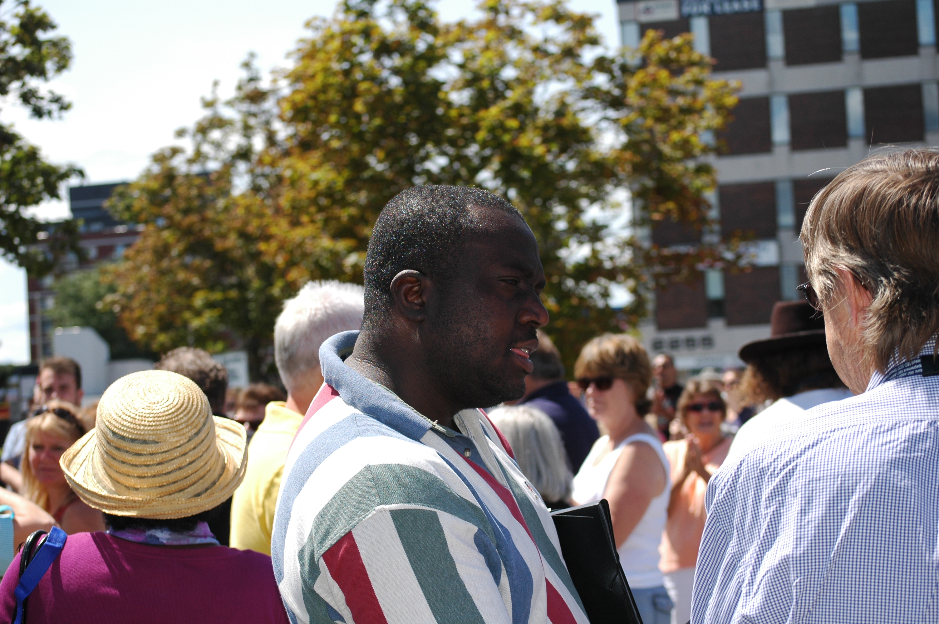 Still, the municipal candidates were not the only ones there! Here, Ade Olumide, chair of OTAG (Ottawa Taxpayers’ Advocacy Group) can be seen talking to the gold-expert John Button (OK – I only got a bit of the back of Mr. Button’s head…).